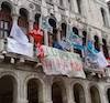 Lo striscione. Alle 17.15 sopra 1 teste dei poliziotti in assetto c battaglia viene calato un grande striscione bianco. «Il conto lo paga chi ha rubato», c'è scritto. Sul pennone sventolano le bandiere rosse della Cgil, quelle azzurre di Cisl e Diccap, quella a strisce della Uil. Pian piano salgono altri gruppetti di manifestanti. Finché intorno alle 19 arriva l'annuncio: «Il Comune è occupato, di qui non ci muoviamo».