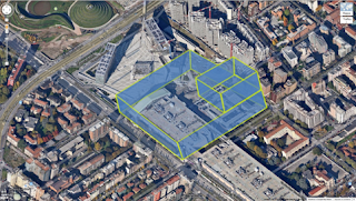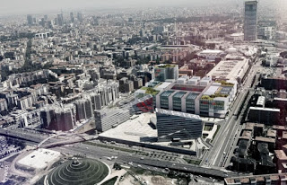 Nella foto: in primo piano il nuovo stadio (progetto Arup) con a fianco la sede sociale del Milan (progetto Gino Valle), al centro la parte residua dello "Steccone " di Bellini, sullo sfondo la torre di Isozaki in costruzione, in attesa delle altre due.