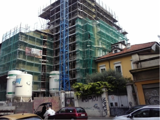 Il 10 dicembre 2003 (tredici anni fa!) apparve in eddyburg, poi in una raccolta della Libreria Clup, Parole in rete, 2005, un primo articolo di cui basta citare il titolo, La distruzione della linea del cielo milanese, per comprendere quali effetti perversi avesse già provocato l’applicazione della «legge dei sottotetti». Stime davano per sicuri 4.500 casi nel 2002-2003 cui se ne dovevano aggiungere diverse migliaia precedenti o in via di attuazione. Durante gli anni successivi tale maniera di costruire la città si moltiplicò secondo una funzione pressoché esponenziale (e altri articoli non mancarono di contestarlo) fino a saldarsi con la nuova fase delle concessioni ingiustificate a sopralzare di x piani a prescindere dai sottotetti e, peggio, come introdotto sopra, ad applicare l’utilizzo spropositato e incontrollato delle slp: persino dieci e più piani inventati da preesistenza zero, se così posso esprimermi. L’immagine a fianco (fotografia di Sergio Brenna) rappresenta il «ricupero in altezza della slp sotterranea di precedenti officine» (dizione regolamentare). Sorprende (per modo di dire…) che nessuno, appartenente a qualunque grado amministrativo, regionale o comunale, e nemmeno gli ordini professionali abbiano mai preteso la secca cancellazione dell’anomalia.
