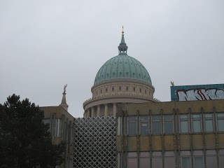 In questo magniloquente concento di antiche forme, pochi forse avranno cuore di ricordare che proprio in San Nicola e in questa piazza il 21 marzo del '33 si tenne, nell'ambito della solenne presentazione ufficiale del nuovo Parlamento al presidente Hindenburg (il famigerato "Potsdamer Tag"), la messa che consacrò l'alleanza tra la Chiesa luterana e il potere nazista appena insediato (una splendida mostra su Lutero e il Nazismo, alla Topographie des Terrors di Berlino, ne offre la documentazione fotografica). "Potsdam costruisce una Sinagoga" risponde oggi un grande manifesto che campeggia 200 metri più in là, dando sostanza di slogan all'auspicio della locale comunità ebraica; ma da 6 anni ancora non si sa bene se, quando e dove tale sinagoga dovrebbe sorgere.