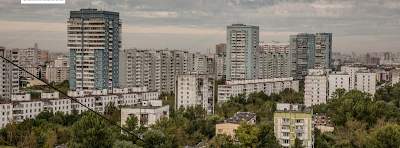 | In primo piano i "khrushchevka" da essere demoliti, sullo sfondo i nuovi edifici Fonte: The Guardian |